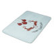 A bath mat which say "Merry Christmas" in curved text. Designed with an illustration of 2 Christmas deer jumping. Deer are made of red and black lumberjack plaid, with a little heart in between them. Red and black plaid Christmas decorations hang down from the top. Light blue background.