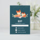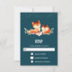 An RSVP card with a drawing of 2 red foxes. One standing up the other laying down. Drawn with watercolor.