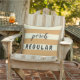 Text says "porch REGULAR" on one side, and "garden GUEST" on the other. Text can easily be customised in order to create fun and relevant alternatives, maybe even contrasting on each side of the pillow. With several pillows it might even turn into some fun game.