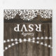 A 2 in 1 rustic country graduation party trifold invitation featuring a rustic wooden barrel background, twinkle string lights, delicate babys breath floral pattern, photos of the graduate, the class year, graduation celebration details, and an rsvp postcard for your guests to cut off and send back.