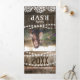 A 2 in 1 rustic country graduation party trifold invitation featuring a rustic wooden barrel background, twinkle string lights, delicate babys breath floral pattern, photos of the graduate, the class year, graduation celebration details, and an rsvp postcard for your guests to cut off and send back.