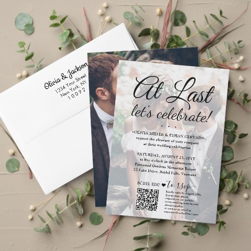 Invite family and friends to a simply elegant marriage celebration with this stylish modern "At Last Let's Celebrate" 2 photo wedding invitation. All wording is simple to personalise for any event type, including a reception only post elopement party, vow renewal ceremony, sequel wedding, 1st anniversary reception, cocktail hour or dinner party. Customise it to include the details of your choice, such as marriage date, dress code, rsvp, website, etc. (IMAGE PLACEMENT TIP: An easy way to centre a photo exactly how you want is to crop it before uploading to the Zazzle website.) The modern minimalist black and white design features two pictures of the newlywed couple, trendy handwritten script calligraphy, and chic typewriter style typography. Whether you eloped, had a smaller downsized minimony or micro wedding, or your special day celebration had to be rescheduled due to a covid pandemic related postponement, the happily ever after party can still get started. Congratulations to the bride and groom!