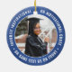 Commemorate the graduate's achievement with an elegant blue and white custom two photo round graduation Christmas ornament. Pictures and all text are simple to customize and can be different on front and back. Include any favorite inspirational quote, motivational saying, school name and degree, congratulations, thanks mom and dad, or other message of your choice. Design features a royal blue faux brushed stainless steel border, personalized modern typography name, school, & class year in a circle, and 2 photos of the graduate, such as senior pictures or images from the commencement ceremony. Makes a thoughtful keepsake graduation gift idea.