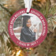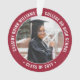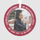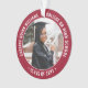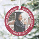 Commemorate the graduate's achievement with an elegant red and white custom two photo round graduation Christmas ornament. Pictures and all text are simple to customise and can be different on front and back. Include any favourite inspirational quote, motivational saying, school name and degree, congratulations, thanks mum and dad, or other message of your choice. Design features a crimson red border, personalised modern typography name, school, & class year in a circle, and 2 photos of the graduate, such as senior pictures or images from the commencement ceremony. Makes a thoughtful keepsake graduation gift idea.