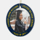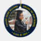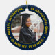 Commemorate the graduate's achievement with an elegant blue and gold custom two photo round graduation Christmas ornament. Pictures and all text are simple to customize and can be different on front and back. Include any favorite inspirational quote, motivational saying, school name and degree, congratulations, thanks mom and dad, or other message of your choice. Design features a dark blue border, personalized modern typography name, school, & class year in a circle, and 2 photos of the graduate, such as senior pictures or images from the commencement ceremony. Please note that gold is printed yellow color, not metallic foil. Makes a thoughtful keepsake graduation gift idea.