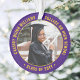 Commemorate the graduate's achievement with an elegant purple and gold yellow custom two photo round graduation Christmas ornament. Pictures and all text are simple to customise and can be different on front and back. Include any favourite inspirational quote, motivational saying, school name and degree, congratulations, thanks mum and dad, or other message of your choice. Design features a green border, personalised modern typography name, school, & class year in a circle, and 2 photos of the graduate, such as senior pictures or images from the commencement ceremony. Makes a thoughtful keepsake graduation gift idea.