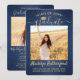 Share the joy of a high school or college graduation and invite family and friends to celebrate with these custom 2 photo navy blue and gold party invitations. All pictures and wording are simple to personalise. (IMAGE PLACEMENT TIP: An easy way to centre a picture exactly how you want is to crop it before uploading to the Zazzle website.) This template is formatted for a graduation party, but can easily be customised as an open house invite or announcement card. Simply change the text to include any details of your choice, such as parents' names, special honours, degree title, favourite inspirational quote, graduate's future plans or new address. If there's any text not wanted simply delete it. Design features a dark blue brushed background, faux foil mortar board cap, handwritten style script calligraphy, modern minimalist typography, and two photos of your choice, such as senior pictures or images from the commencement ceremony. Please note that gold is printed colour, not metallic foil. These elegant graduation announcement cards are a stylish way to share your special day celebration with family and friends. Congratulations to the graduate!
