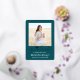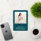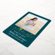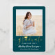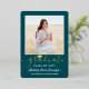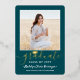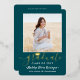 Invite family and friends to celebrate a high school or college graduation with stylish custom 2 photo teal, white and gold foil invitations. Pictures and wording are simple to personalize. (IMAGE PLACEMENT TIP: An easy way to center a photo exactly how you want is to crop it before uploading to the Zazzle website.) Front of design is printed with real metallic foil on a blue-green background. It features a mortar board cap, handwritten style script calligraphy, elegant modern typography, and two photos of your choice, such as senior pictures or images from the commencement ceremony. This elegant graduation invitation card is a trendy and chic way to begin your special day celebration. Congratulations to the graduate!