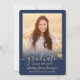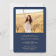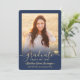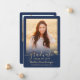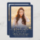 Share the joy of a high school or college graduation with these custom 2 photo navy blue and gold announcements. All pictures and wording are simple to personalise. (IMAGE PLACEMENT TIP: An easy way to centre a photo exactly how you want is to crop it before uploading to the Zazzle website.) This template is simple to customise with any details of your choice, such as party invitation info, parents' names, special honours, degree title, favourite inspirational quote, graduate's contact info, future education plans, or new job position. If there's any text not wanted simply delete it. Design features a faux gold foil mortar board cap, handwritten style script calligraphy, modern minimalist typography, and two photos of your choice, such as senior pictures or images from the commencement ceremony. These elegant graduation announcement cards are a trendy and chic way to share your special day celebration with family and friends. Congratulations to the graduate!
