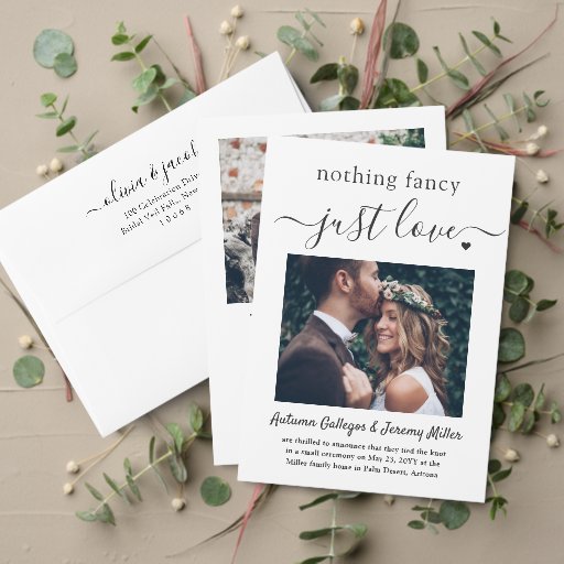 Invite family and friends to a simply elegant wedding reception with this stylish modern "nothing fancy just love" 2 photo invitation. All wording is simple to personalise for any reception only celebration, including a post elopement party, vow renewal ceremony, sequel wedding, 1st anniversary, cocktail hour or dinner party. Customise it to include the details of your choice, such as marriage date, dress code, rsvp, website, etc. (IMAGE PLACEMENT TIP: An easy way to centre a photo exactly how you want is to crop it before uploading to the Zazzle website.) The modern minimalist black and white design features two pictures of the newlywed couple, trendy handwritten script calligraphy, and chic typewriter style typography. Whether or not you eloped due to the covid pandemic or downsized to a smaller, more intimate minimony or micro wedding, the happily ever after party can still get started. Congratulations to the bride and groom!