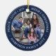 Celebrate the simple joys of the holidays with a custom two photo navy blue and white round ceramic ornament. All text and pictures on this template are simple to personalize and can be different or the same on front and back. If preferred, change "Peace Love Joy Merry Christmas" to any quote or saying. (IMAGE & TEXT DESIGN TIPS: 1) To adjust position of wording, add spaces at beginning or end. 2) To center the photo exactly how you want, crop it into a square shape before uploading to the Zazzle website.) Modern minimalist design features a navy blue and white border, stylish typography name and year, and 2 images of your choice. This unique family keepsake adds an elegant touch to Xmas home decorations.