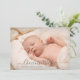 Modern baby photo birth announcement for girl or boy. Simply use this template to add your own custom photo on the front and back of the card; of your own sweet baby and personalise with baby's name in the elegant trendy script typography.