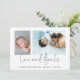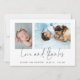 Minimalist 2 Photos Love and Thanks Script Birth Announcement. Combing your thank you and birth announcement all in one. Simply replace the two sample photos with your own and personalise with your baby's name and birth date and weight at the bottom and thank you message on the back. Love and Thanks is in a stylish set script.