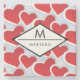 Stone marble coaster personalised with a name and initial designed with a repeating pattern of 2 different sized red hearts each heart surrounded by a white border. A diamond shaped frame layered over top with your text inside.
