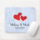 A custom mousepad with your wedding details. Designed with an illustration of 2 paper hearts joined together - red with a white border. Set on an elegant icy blue marble background.