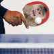 Hit me with your best shot. Photograph of a monkey with a ping pong ball in his mouth. The other side of the paddle has the same monkey with his mouth open. Change the background colour to any colour you want.