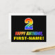 The front of this cheerful, fun, and colourful birthday themed postcard design features a large number "2" and the message "HAPPY BIRTHDAY,", both having a rainbow spectrum gradient inspired pattern colouring, along with a bold yellow customisable recipient name. The front also has a minimalist black coloured background. The back of the postcard has a customisable birthday greeting message, or could perhaps be cleared and left blank if a message is to be written by hand instead. A colourful personalised birthday postcard like this might be a fun way to send a message celebrating somebody’s second birthday. [~Z0000474]