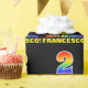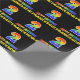 This cheerful, fun, and colourful birthday wrapping paper design features a large number "2" and the message "HAPPY BIRTHDAY,", both having a rainbow spectrum gradient inspired pattern colouring, along with a bold yellow custom recipient name. The background is coloured black. Fun birthday themed wrapping paper like this might be used to wrap a gift or present being given to somebody who is celebrating their second birthday. [~Z0000475]