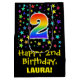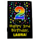 This colourful, exciting, and vibrant birthday giftbag design features a large number "2" with a rainbow spectrum gradient inspired pattern, along with the message "Happy 2nd Birthday,", and a customisable recipient name. It also has a background pattern featuring star shapes of various sizes and colours. A birthday themed gift-bag like this might be a fun way to wrap a gift or present being given to somebody who is celebrating their second birthday. [~Z0000510]