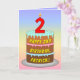 This upbeat and fun birthday themed greeting card design features a cartoon-style depiction of a three-tier birthday cake having a numeral-shaped candle on top showing the number “2“, along with the message “HAPPY 2ND BIRTHDAY,”, and a personalised recipient name. The background of the front features a multicolored pastel rainbow spectrum inspired gradient pattern. The inside has a personalised birthday greeting message, or could perhaps be cleared and left blank if a message is to be written by hand instead. A joyful, customisable birthday greeting card like this might be a fun way to send some birthday wishes to somebody who is celebrating their second birthday. [~Z0000625]