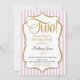 An elegant pink gold girls 2nd birthday invitation, featuring pink and white stripes with a faux gold glitter accent frame, cute black and gold text and a huge fancy "Two!" at the top. For your favourite two year old birthday girl.