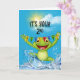 Green frog with birthday banner jumping out of blue water on sky background for a child's 2nd birthday.