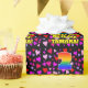 This fun and cheerful birthday-themed wrapping paper design features a large number “2” with a rainbow spectrum gradient inspired pattern, along with the message “Happy 2nd Birthday,”, and a personalised name. The background features a pattern of pink, purple, and red heart shapes. Birthday themed wrapping paper like this might be a fun way to wrap a gift or present being given to somebody who is celebrating their second birthday. [~Z0000549]
