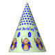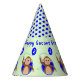 This pale green coloured hat has a personalizable message, and a row of cheeky smiling monkeys with birthday balloons.