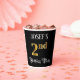 This ornate and opulent birthday paper cup design features an editable name and the message “2nd Birthday Party”. The large number “2nd” has an imitation/faux gold-inspired coloring pattern, and the words “Birthday Party” are in elegant script-style text. The background is colored black by default (although it can be customized). Fancy, luxurious paper cups like this might be useful to have at a birthday party being held in celebration of somebody’s second birthday. [~Z0000567]