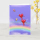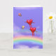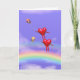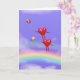 A cute birthday card with two little red heart characters balancing on a rainbow holding balloons with the numbers 1 and 2. Original verse inside.