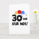 Three balloons and text that reads "30 and still hot!" is featured on 30th birthday cards, T-shirts, mugs, buttons, and more.