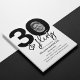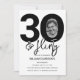 Stylish editable 30th birthday invitation featuring, 30 & flirty, a large 30 with a photo inside the zero, with black font over a classic white background and a birthday celebration template that is easy to personalise.