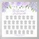 This light purple floral 30 table wedding seating chart features a rustic boho chic design with hand painted watercolor roses, blossoms, and flowers shades of lilac, lavender, and dusty purple along with sprigs of eucalyptus and garden greenery. The elegant script calligraphy title reads "Welcome! please find your table". The seating chart has space for 300 guests with 10 seats per table and the couple's names and wedding date are displayed at the bottom. Beautiful way to add style, and backyard charm to your reception while making it easy for your guests to find their seats.