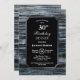 A rustic silver-bordered blue and grey barn wood 30th birthday dinner invitation with the white text highlighted on a black background.