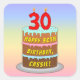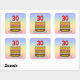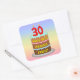 This upbeat and colourful birthday square sticker design features a cartoon-style depiction of a three-tier birthday cake having numeral-shaped candles on top showing the number “30“, along with the message “HAPPY 30TH BIRTHDAY,”, and an editable recipient name. The background features a multi-colour pastel rainbow spectrum inspired gradient pattern. Cheerful birthday themed stickers like these might be distributed or used at a party in celebration of somebody’s 30th birthday, or perhaps used when preparing invitations or gifts/presents for such an event. [~Z0000624]