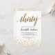 The design features 'thirty' in a modern elegant script and gold confetti dots accent.