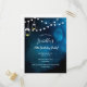 A romantic invite card for a 30th birthday party . A dark and blue evening and night with a full moon and string lights. Two rustic painted mason jars with candles. Templates for date, name, eventplace, and RSVP details. The name is written with a modern hand lettered style script. White letters.