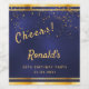 A 30th Birthday Party celebration for him, boy, guy in dark blue, navy blue background. The blue colour is uneven. With a faux gold frame and golden confetti sprinkle, golden coloured letters. Text: Cheers! Personalise and add a name and age 30, golden letters. The name is written with a modern hand lettered style script.