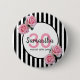 Classic slim black and white vertical stripes as background. With girly, feminine and romantic pink roses as decoration. A white and black frame on front with template for age, name and date. Age number 30 in pink, name and date in black. The name is written with a hand-lettered style script. Perfect as a 30th birthday favour or as a save the date reminder for your guests.