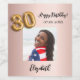 A rose gold, blush pink background decorated. Personalise and add a date, name and a photo. Age number written with a balloon style font.