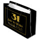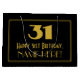 This 1920s/1930s look inspired vintage style birthday themed gift bag design features a large art deco look inspired number "31", the message "Happy 31st Birthday,", an editable name, and a border pattern consisting of thin lines. It features a black-coloured background. A birthday themed gift bag like this could be used to wrap a gift or present being given to somebody who is celebrating their 31st birthday. [~Z0000501]