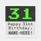 This geeky and fun birthday themed paper napkin design features a large green retro video game style number "31" on a black coloured background. It also features the birthday greeting message "Happy 31st Birthday,", and a name that can be personalised. Silly and nerdy paper napkins like this might be useful at a party being held to celebrate the thirty first birthday of a computer system administrator, a computer programmer, or somebody who really likes vintage video gaming. [~Z0000404]