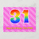 The front of this cheerful, upbeat, and fun birthday themed postcard design features a large number "31" with a rainbow spectrum gradient inspired pattern, along with the message "Happy 31st Birthday,", and a customisable recipient name. The front additionally features a happy dark pink and light pink striped pattern with heart shapes. The back features a custom birthday greeting message, or could perhaps be cleared and left blank if a message is to be written by hand instead. A customisable birthday postcard like this might be a fun way to send a message in celebration of somebody’s thirty first birthday. Postcards like this might also be used to invite guests to a birthday party being held for somebody who is turning 31 years old. [~Z0000449]