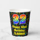This exciting and cheerful music-themed birthday paper cup design features a large number “32” having a rainbow spectrum gradient inspired pattern. It also features the message “Happy 32nd Birthday,”, and a customisable name. The background features a colourful pattern of various music notes and symbols having a variety of sizes and colours. Colourful, vibrant paper cups like this might be fun to use at a birthday celebration being held to celebrate somebody’s 32nd birthday. [~Z0000541]