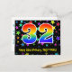 The front of this fun, colourful, and exciting birthday themed postcard design features a large number "32" having a rainbow spectrum gradient inspired pattern. It also features the message "Happy 32nd Birthday,", and a personalised recipient name. The front additionally features a colourful and vibrant background pattern featuring star shapes of different sizes. The back features a personalised birthday greeting message, or could perhaps be cleared and left blank if a message is to be written by hand instead. A customisable birthday postcard like this might be a fun way to celebrate somebody’s thirty second birthday. Postcards like this might also be used to invite guests to a birthday party being held for somebody who is turning 32 years old. [~Z0000447]