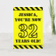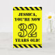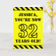 The front of this bold and attention-grabbing birthday-themed greeting card design features a personalised name and the message "YOU’RE NOW 32 YEARS OLD!" in black stencil style text on a yellow coloured background. The front also features an eye-catching yellow and black striped pattern at the top and bottom edges. The inside features an editable birthday greeting message, or could perhaps be cleared and left blank if a message is to be written by hand instead. A customisable birthday card like this might be a fun way to send a message in celebration of somebody’s thirty second birthday. [~Z0000413]