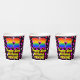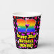 This cheerful and happy birthday-themed paper cup design features a large number “32” with a rainbow spectrum gradient inspired pattern, along with the message “Happy 32nd Birthday,”, and a custom name. The background features a pattern of purple, pink, and red heart shapes of various sizes. Happy, loving paper cups like this might be fun to use at a birthday celebration/party being held to celebrate somebody’s thirty second birthday. [~Z0000548]