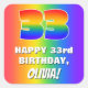 This joyful and cheerful birthday square sticker design features a large number “33” having a colourful rainbow spectrum inspired gradient pattern. It also features the message “HAPPY 33rd BIRTHDAY,”, and a personalised recipient name. The background also features a fun multicolored rainbow spectrum inspired gradient pattern. Exciting, fun, personalised stickers like this might be given as a birthday present, or used while wrapping presents/gifts, or perhaps used as a birthday party decoration when celebrating somebody’s thirty third birthday. [~Z0000571]