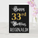The front of this ornate and lavish birthday themed greeting card design features the message “Happy 33rd Birthday,”, plus a custom recipient name. Part of the message is in a fancy script-style text. The large number “33rd” features a faux/imitation gold-inspired look pattern. The background is coloured black. The inside has a personalised birthday greeting message, or could perhaps be cleared and left blank if a message is to be written by hand instead. A formal, customisable birthday greeting card like this might be sent to celebrate somebody’s thirty-third birthday. [~Z0000559]