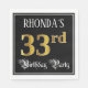 This elegant and ornate birthday-themed paper napkin design features a customizable name and the message “33rd Birthday Party”. The large number “33rd” has an imitation/faux gold-inspired coloring pattern, and the words “Birthday Party” are in luxurious script-style text. The background is colored black by default (although it can be customized). Opulent, luxurious paper napkins like this might be used at a birthday party/celebration being held in celebration of somebody’s thirty third birthday. [~Z0000565]